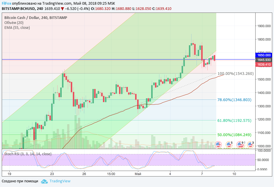 Вчера цена Bitcoin Cash консолидировалась в области цен 1650.00 USD за монету. На часовом тайм-фрэйме в этой области проходит скользящая средняя EMA55, которая поддерживает пару BCH/USD. Была предпринята неудачная попытка пробить нижнюю границу восходящего тренда с целью возврата в зелёный коридор роста.