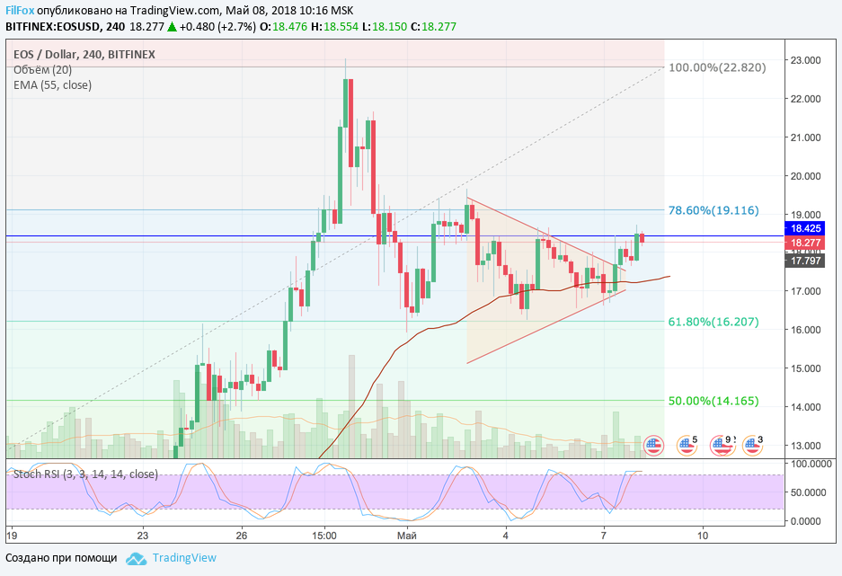 Наш технический прогноз на прорыв нижней границы сужающегося диапазона и продолжение медвежьего тренда не оправдался. Цена EOS пробила верхнюю границу, но преодолеть сопротивление уровня 18.42 USD пока не удалось. Повторный сегодняшний ре-тест этого уровня тоже не принёс успех EOS. Так что говорить о каком-либо серьёзном восстановлении пока рано. Для этого необходимо преодолеть сопротивление 78.6% фибо и закрепиться над ним, после максимума на отметке 20.00 долларов за токен. А пока этого не произошло, продолжение отката может возобновится после разворота от уровня 18.42 USD.