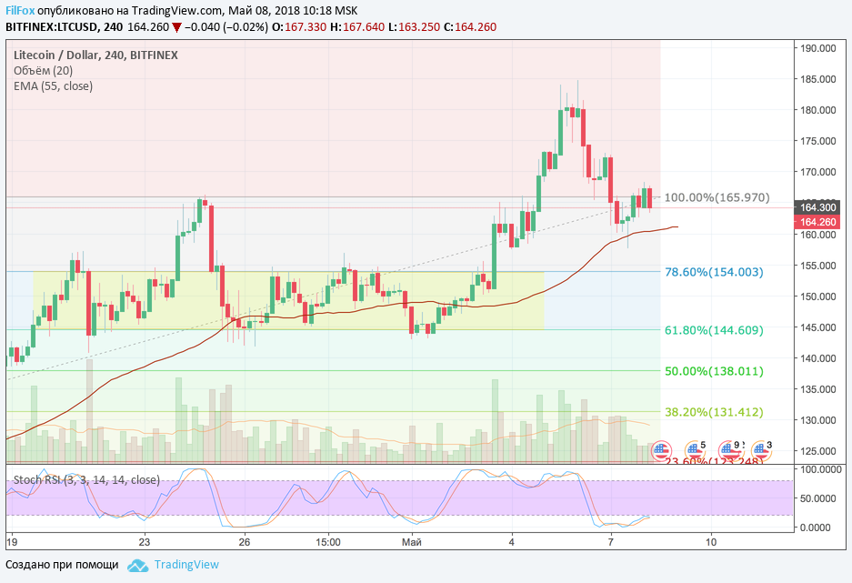 Litecoin вчера на снижении установил минимум на отметке 157.55 USD и воспользовавшись поддержкой скользящей средней, отскочил к уровню 100% фибо (165.97 USD). Сегодня цена консолидировалась на этом уровне фибоначчи, и после окончания консолидации снижение может возобновиться к уровню 78.6% фибо (154.00 USD)
