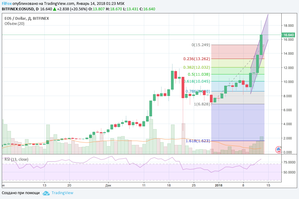 На текущий момент EOS замыкает десятку криптовалют по объёму капитализации имея в своём активе около 10 млрд долларов США, тогда как на конец 2017 года этот показатель составлял всего 5 млрд. долларов. Буквально за две прошедшие недели нового года EOS смог удвоить объём капитализации. Давайте проследим как это происходило на дневном таймфрейме.