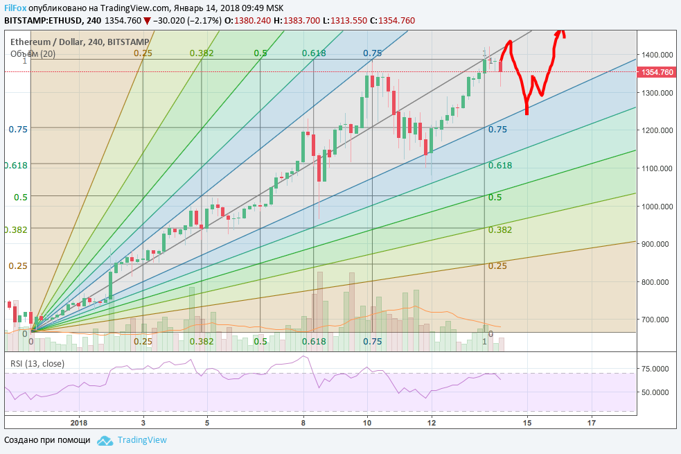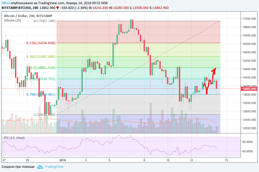 В начале недели мой прогноз предусматривал, что цена на Bitcoin достигнет зоны пятнадцати тысяч без какой либо коррекции в зону 13200.00 USD, однако после того, как 10 января пара BTC/USD резко упала, необходимо было искать глубину спада.