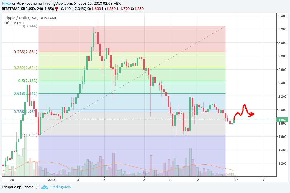 Ripple по-прежнему находится в узком боковом диапазоне. Обозначив локальный минимум 1.76 USD, цена снова восстанавливается к равновесному уровню 78.6% фибо к значению 2.00 USD за монету. Полагаю, что в начале этой недели цена удержится в боковике.