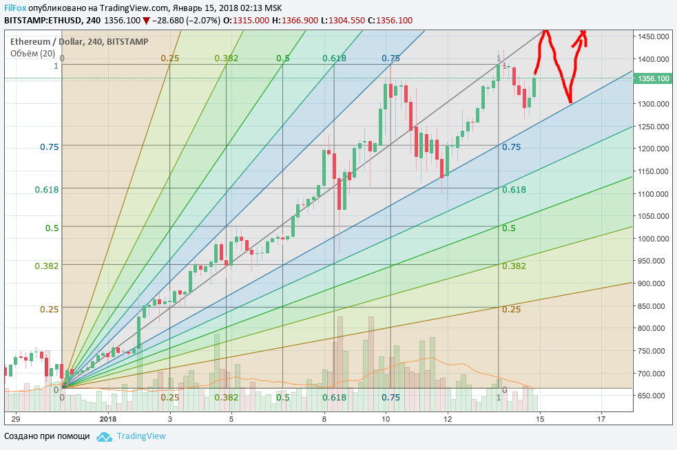 Ethereum в первые дни этой торговой недели, вероятнее всего, начнёт с нового глобального максимума, где-то в районе отметки 1480.00 USD, и продолжит движение в коррекции. Глубина коррекции, полагаю, не будет выходить за границы серой зоны веера фибоначи.