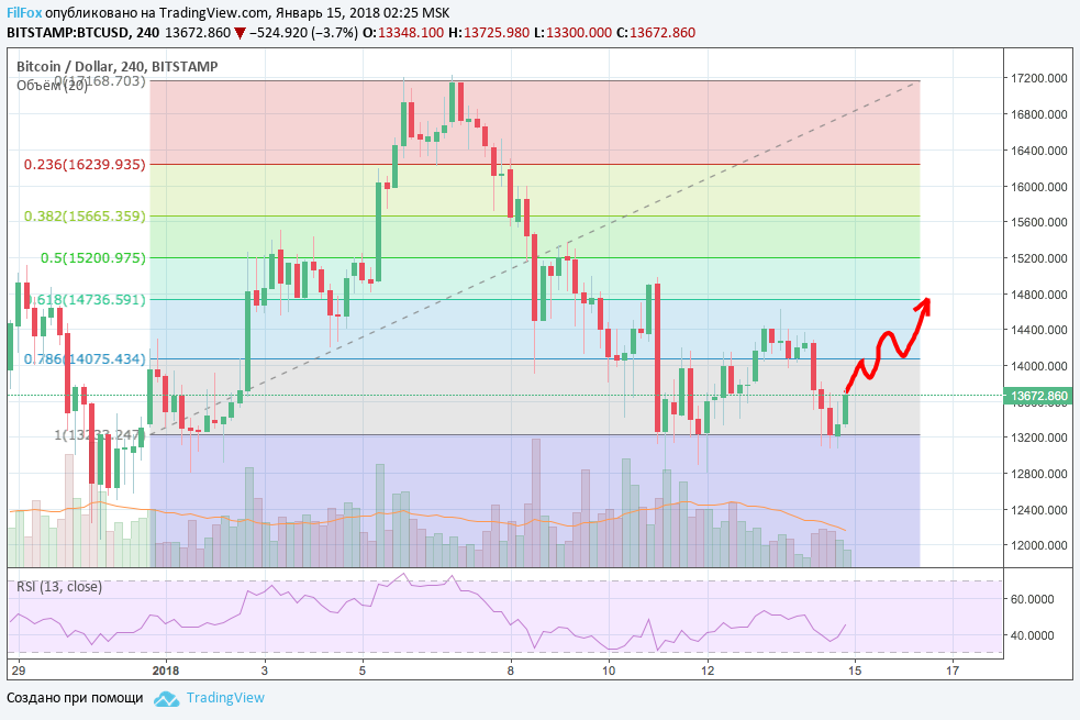 Цене на Bitcoin пора бы уже на этой неделе активнее выходить из затянувшейся коррекции. После ре-теста зоны минимумов на уровне 13200.00 USD, полагаю что цена сможет восстановиться к уровню сопротивления 61.8% фибо, в область цен 14800.00 долларов за биток.
