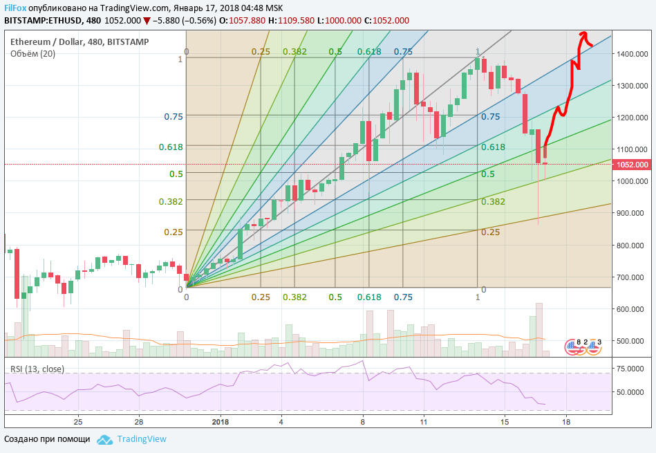Для Ethereum зона «равновесия» не определена, потому что цена начала обваливаться на росте к очередному максимуму. Можно предположить, что восстановление и консолидация цены произойдёт в районе 1400.00 USD за эфир.