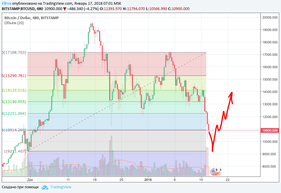 Полагаю, что Bitcoin ещё не достиг своего дна и цена будет "нащупывать" уровень поддержки в зоне девяти тысяч. После чего так же стремительно начнёт восстанавливаться: сначала к уровню двенадцати тысяч, а потом консолидируется на 14000.00 USD за BTC.