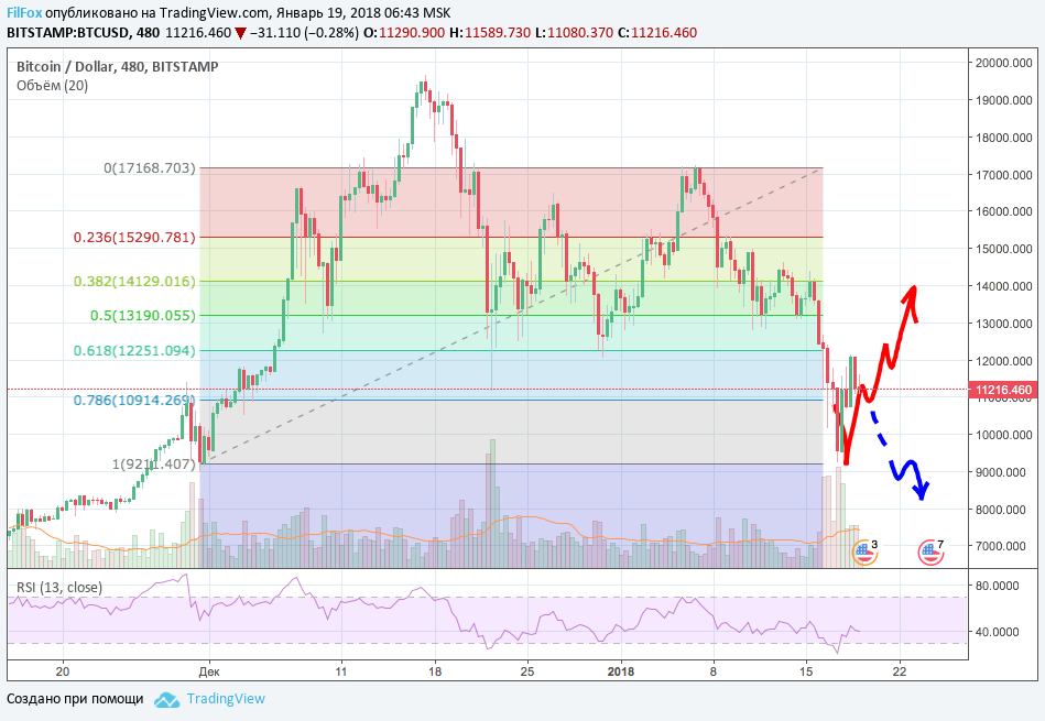 Движение цены BTC/USD по вчерашнему «сценарию», и закрытие торгов 19 января выше отметки 13500.00 USD, будет означать отмену даун-тренда и восстановления цены к ключевому уровню поддержки 38.2% фибо - от которого начались ажиотажные распродажи.