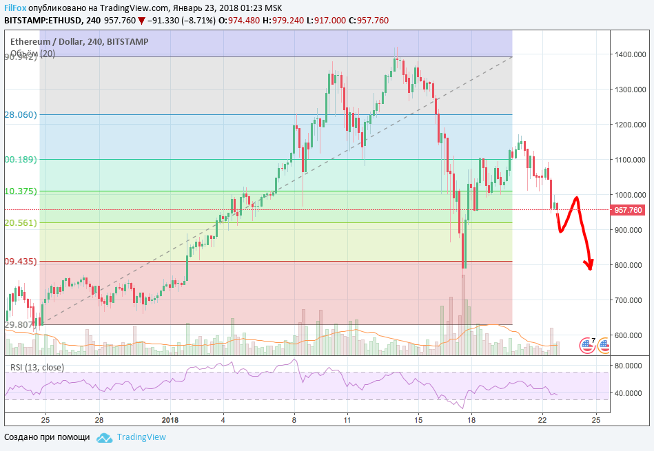 22-23 января тенденцию на снижение продолжили практически все криптовалютные пары, постепенно снижая общую капитализацию к 535 млрд. долларов США. Ethereum пробил очень важную психологическую зону поддержки в тысячу долларов за эфир и возобновил даун-тренд к минимумам в области 800. 00USD, сокращая капитализацию до 98 млрд долларов, но по-прежнему удерживая почётное второе место по уровню капитализации.