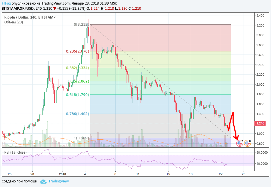 Занимая третью строчку турнирной таблицы по объёму капитализации с результатом 52 млрд. долларов, Ripple направляется к минимумам, в область цен 900.00 долларов за рипл. Правда индикатор RSI выходит из нейтральной зоны в зону перепроданности и сигнализирует о предварительном откате до уровня 1.40 USD. После этого последует ре-тест уровня поддержки 909.00 USD