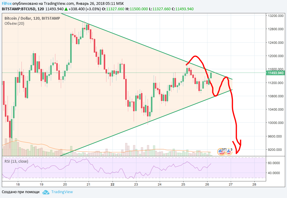 25 января цена BTC/USD продолжила консолидироваться в пределах фигуры треугольник, причём торги проходили на очень маленьких объёмах, показатель RSI находился в нейтральной зоне, и к концу дня его значение было на отметке 50%. Полагаю, что 26 января цена ещё продолжит консолидироваться, сужая диапазон, в пределах треугольника. Импульс на пробой нижней границы треугольника приведёт цену к новым минимумам на уровне 8500.00 USD - 8 300.00 USD. Если импульс будет бычьим, то пробой верхней границы фигуры «треугольник» и консолидация цены выше уровня двенадцать тысяч, сменит медвежий тренд на восходящий.