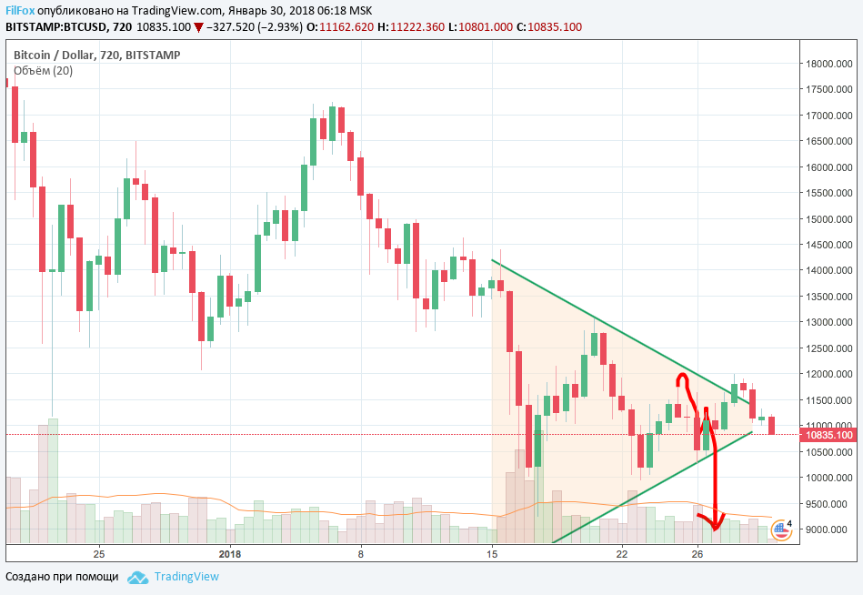 Если же цена всё-таки сможет преодолеть уровень сопротивления на отметке 12100.00 USD, который она не могла преодолеть всю прошлую неделю, то возможен разворот и смена тренда на восходящий.