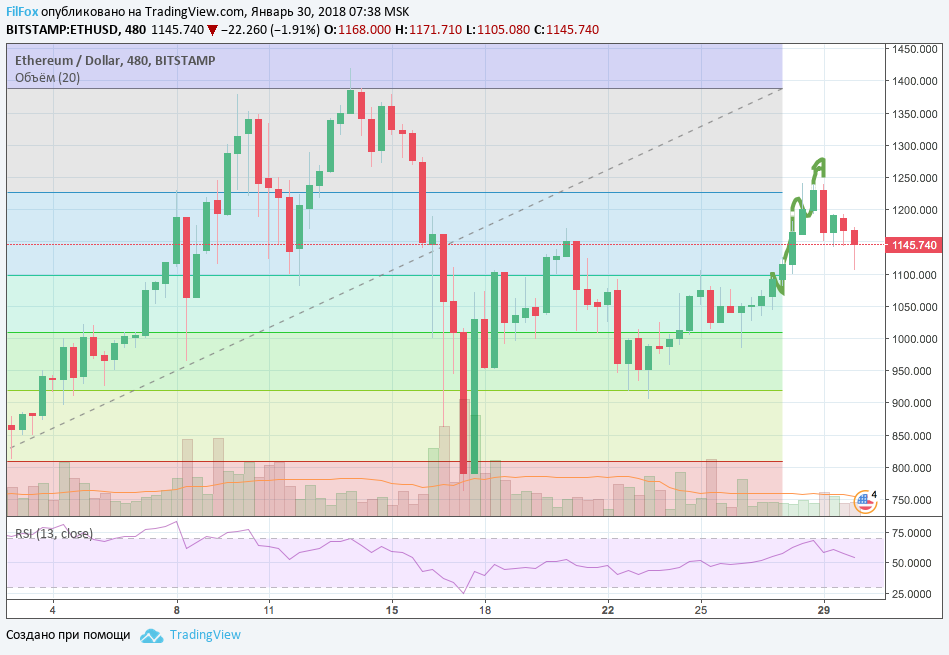 Вчера, цена на Ethereum несколько раз безуспешно пыталась преодолеть сопротивление 78.6% фибо (1226.00 USD). Сегодня ожидается консолидация в голубом диапазоне уровней фибоначи и повторение попытки закрепления выше указанного уровня сопротивления.