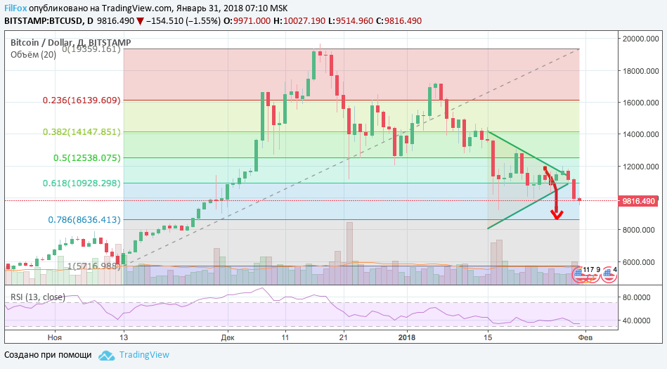 30 января цена на Bitcoin пробила нижнюю границу треугольника и на текущий момент установила минимум на отметке 9 514.00 USD. Показатель относительной силы RSI вышел из нейтральной зоны, но ещё не достиг зоны перепроданности, следовательно снижение цены сегодня продолжится. Можно предположить, что вероятным уровнем поддержки цены BTC/USD является уровень 78.6% фибоначи ( 8 636.00 USD). В области цен 8900.00 USD - 8500.00 USD Bitcoin замедлит падение и попытается консолидироваться в этом диапазоне.
