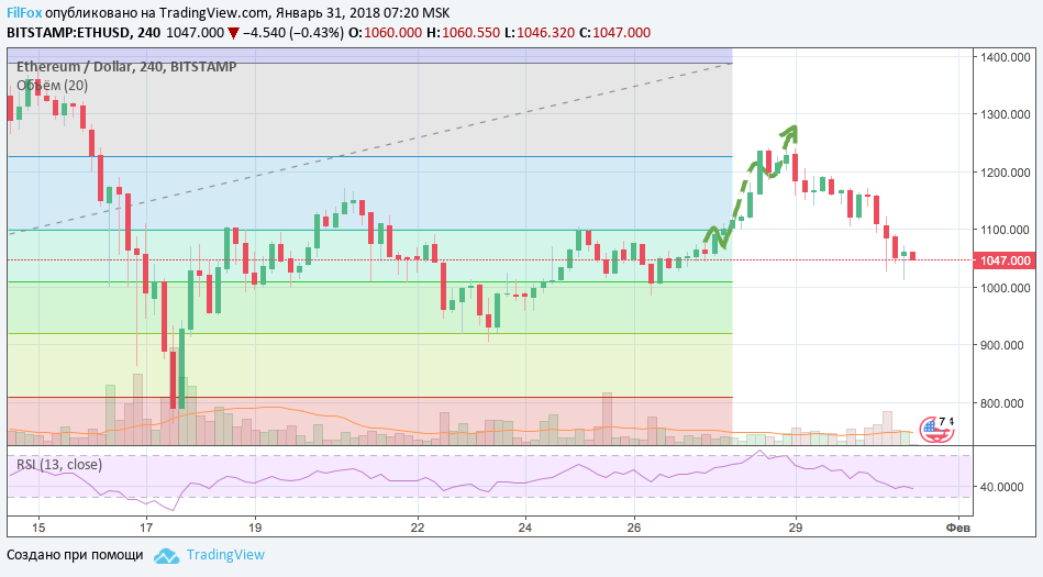 Вчера, Ethereum предпринял повторную попытку преодолеть уровень сопротивления на отметке 12 100.00 USD, но в результате цена не смогла пробить этот уровень и в продолжении всего торгового дня снижалась в голубом диапазоне фибоначи. Во второй половине дня пара ETH/USD пробила уровень поддержки 61.8% фибо (1100.00 USD) и 31 января уже успела установить минимум на отметке 1010.00 USD. Судя по показателю RSI, который находится на уровне 40%, падение цены продолжится, к целевой отметке, которая находится под психологическим значением тысяча долларов, примерно в области 900.00 USD за эфир.