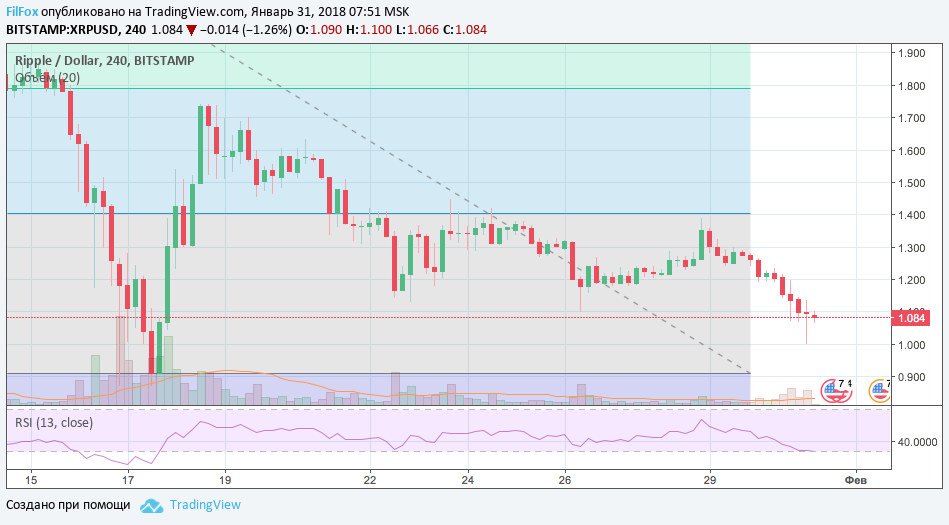 Ripple, вчера, закономерно снижался и сегодня, в начале дня установил минимальное значение 1 доллар за рипл. В дальнейшем, после небольшой консолидации, снижение продолжится в область девяносто центов за монету.