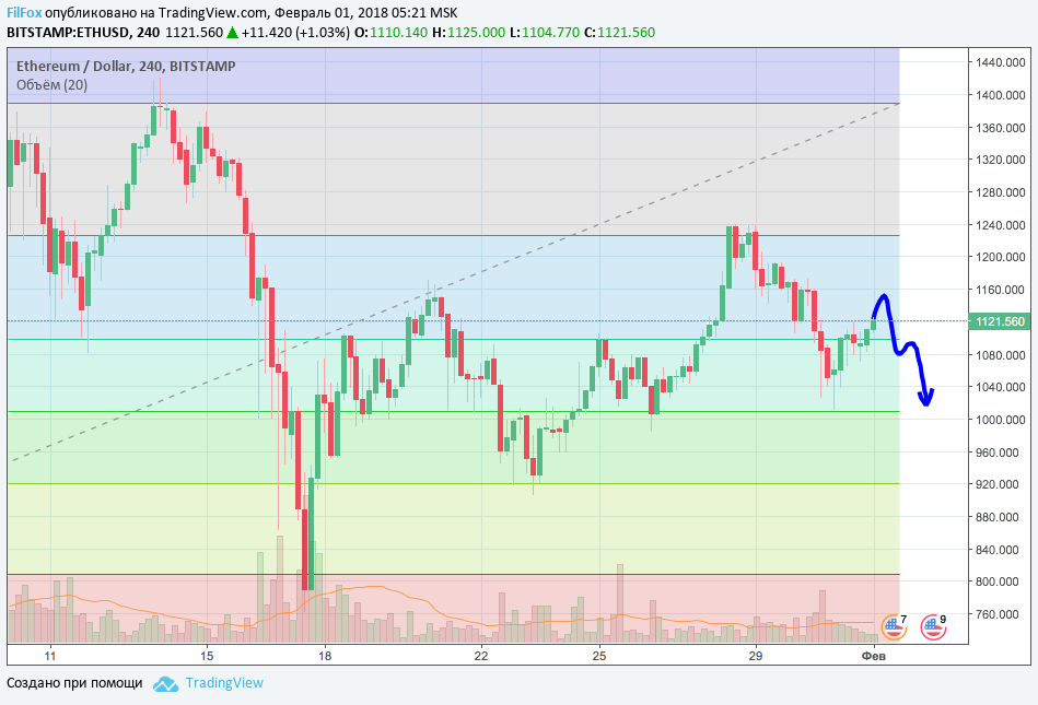 31 января Ethereum отметил дневной минимум на уровне 1010.00 USD и смог восстановиться выше сопротивления 61.8% фибоначи (1100.00 USD). Сегодня, коррекция ограничится уровнем 1160.00 USD, после чего снижение продолжится к психологической отметке 1000.00 долларов за эфир.