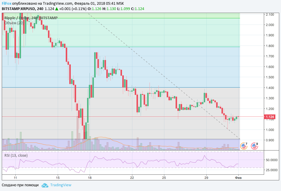 Ripple продолжает боковое движение в узком диапазоне (1.08 USD -1.15 USD), восстановившись после дневного минимума 1 доллар за рипл. Полагаю, что сегодня флэт в этом диапазоне продлится. Чтобы не пропустить импульс выхода из боковика, нужно внимательно следить за новостями.