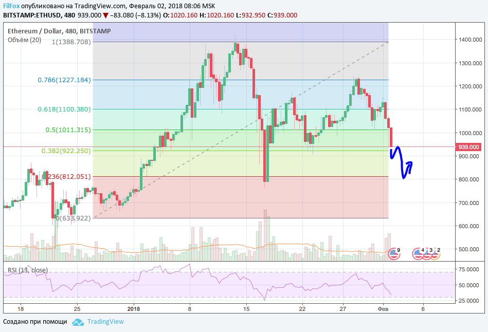 Ethereum вчера выполнил и перевыполнил прогноз по снижению. Пара ETH/USD пробила психологический уровень сопротивления 1000.00 долларов за эфир и установила минимум на отметке 936.00 USD. Однако показатель RSI ещё не вышел из нейтральной зоны в зону перепроданности, следовательно сегодня, снижение может продолжаться к уровню поддержки 23.6% фибоначи (812.00 USD), затем цена немного консолидируется.