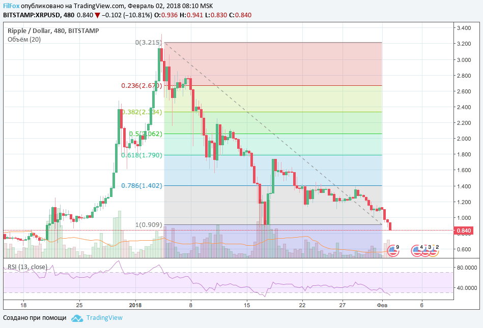Ripple не захотел в одиночестве находится в боковике и за компанию со всеми криптовалютами тоже поддался медвежьему давлению, подешевел до 86 центов за монету. Сегодня падение продолжится, но показатель относительной силы уже находится в зоне перепроданности, значит вскоре будет восстановление.