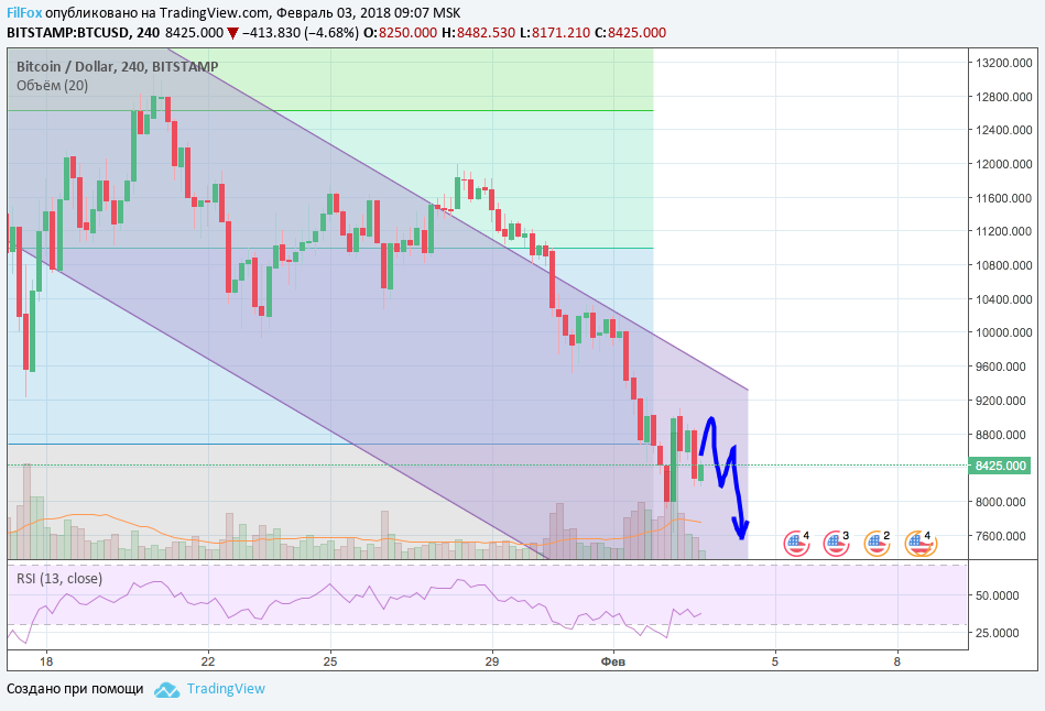 Второго февраля, в концу торгового дня, цена на Bitcoin установила дневной минимум на отметке 7 625.00 USD*. Далее можно было наблюдать, как большой объём покупок восстановил цену до 9000.00 USD.