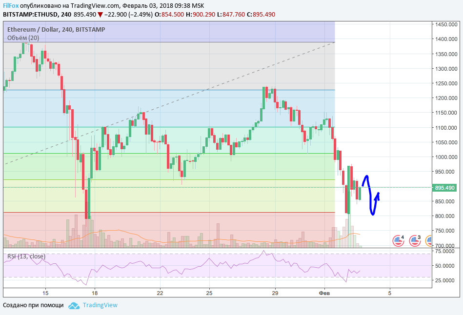 Ethereum вчера проколол уровень поддержки 23.6% фибо (812.00 USD) и установил минимум на отметке 731.00 доллар за эфир. Сегодня цена попытается восстановиться в область 950.00 USD, но под давлением медведей вновь протестирует 23.6% фибо (812.00 USD)