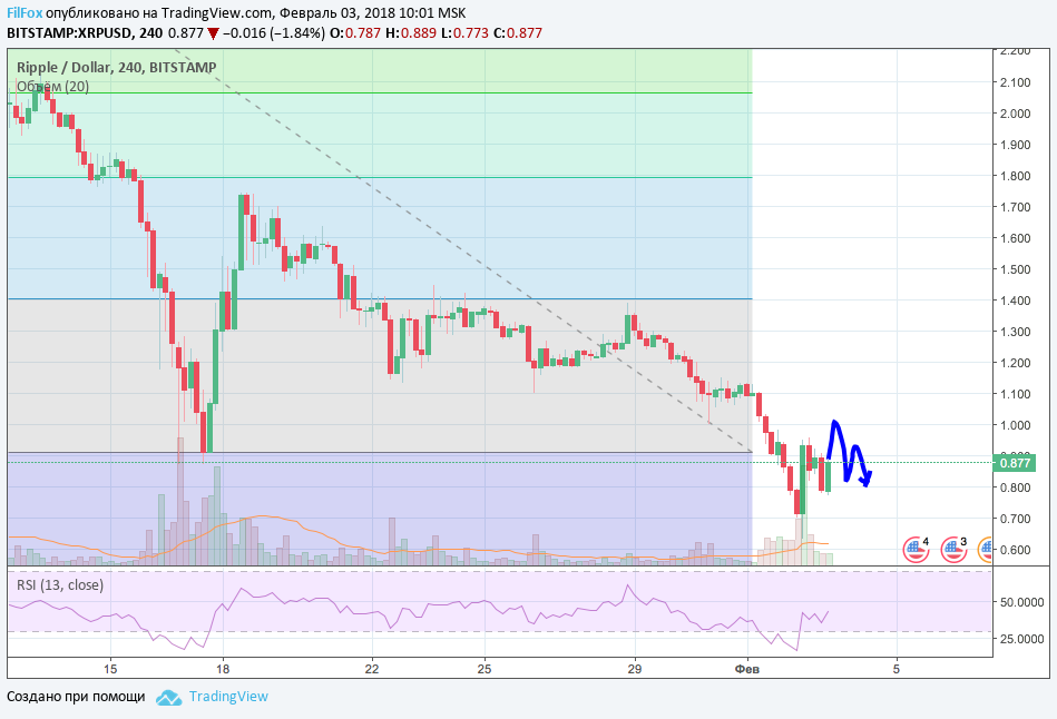Ripple вчера продолжил падение и установил минимум на отметке 63 цента за монету, правда благодаря просто огромным объёмам покупок довольно быстро восстановился в область 90 центов за рипл. Полагаю, что сегодня продолжение движения будет в боковом коридоре в диапазоне 0.800 USD - 1.000 USD.