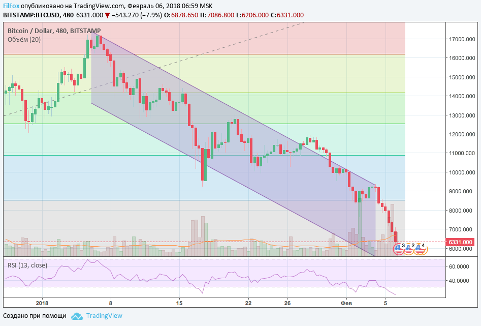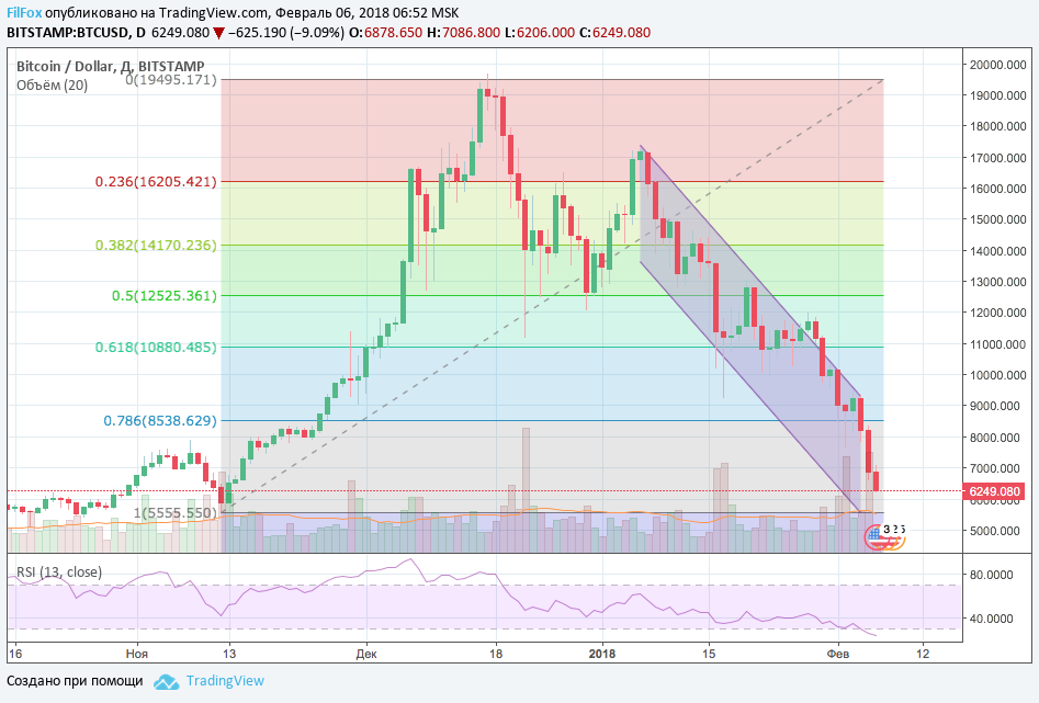 Какой минимальный уровень следует ожидать сегодня, 6 февраля? Судя по индикатору относительной силы RSI, который уже находится в зоне перепроданности, падение цены должно замедлиться на уровне 6000.00 USD и пара консолидируется после того, как протестирует 100% фибо (5 555.55 USD) Хотя, возможно, это программа действий растянется на два дня.