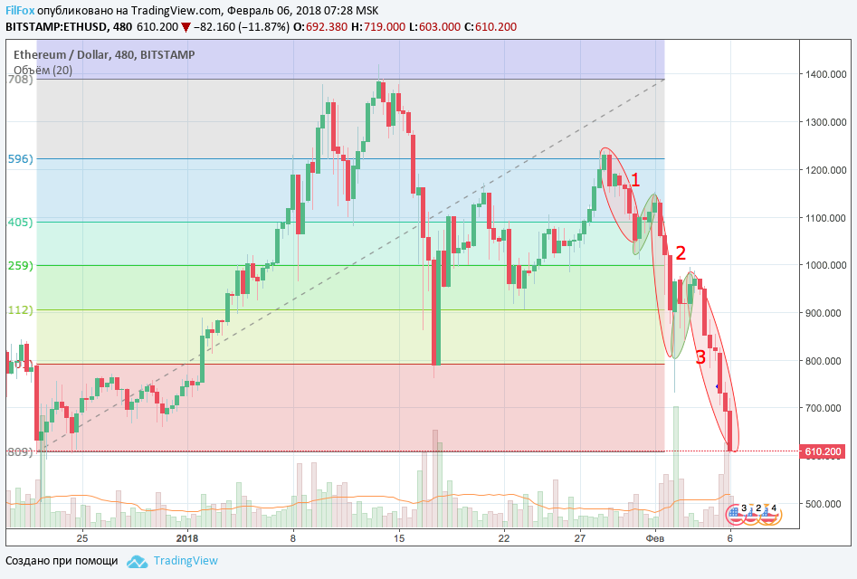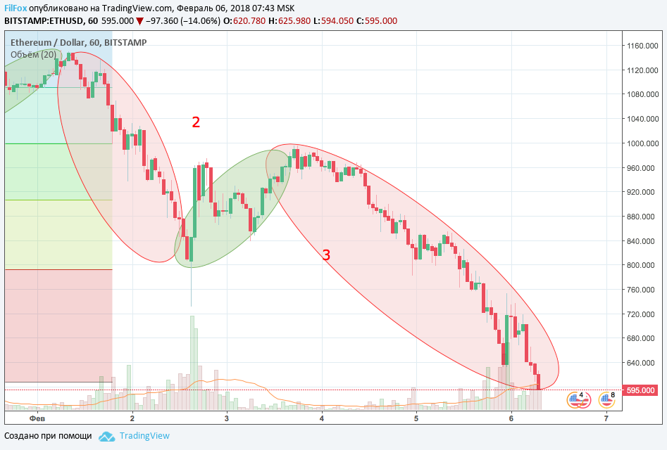 На часовом тайм-фрейма графика цены хорошо видно, как Ethereum, вчера, установил дневной минимум на отметке 632.00 USD и закрыл день котировкой 717.39 USD. 6 февраля восстановление пары не получило дальнейшего продолжения и эфир возобновил движение по нисходящему тренду, и на текущий момент уже проколол 100% уровень фибоначи (600.00 USD).