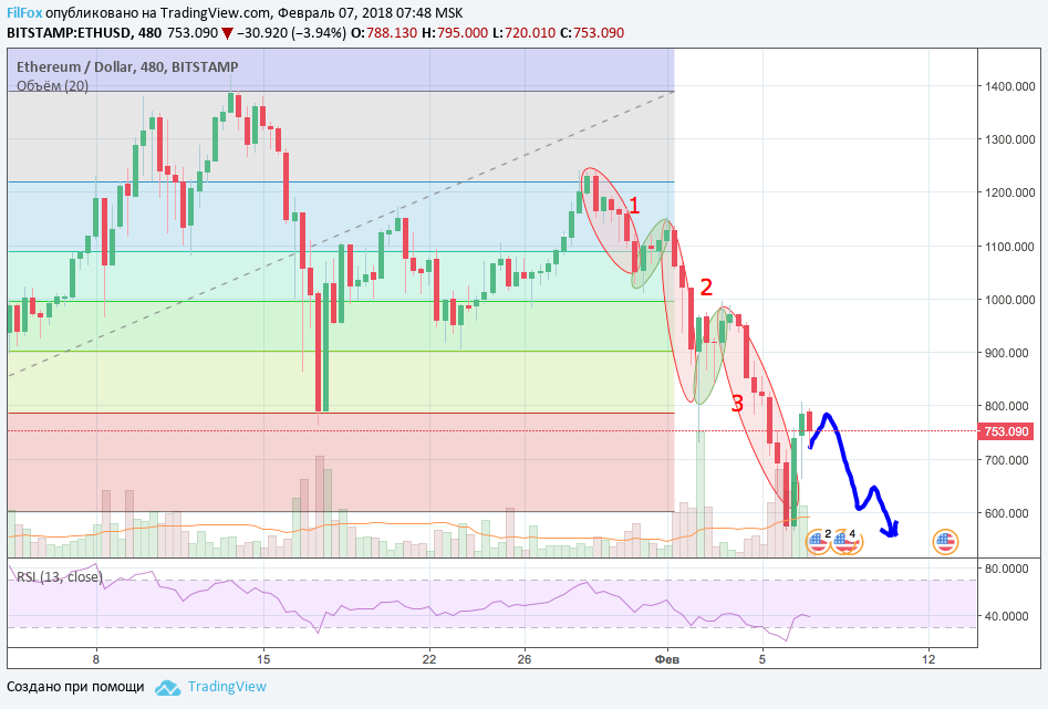 По Ethereum, вчера наблюдалась аналогичная ситуация, как и у Bitcoin. Как только цена достигла прогнозного минимума 565.00 USD, началась волна покупок, спровоцировавшая рост эфира до 808.00 USD. Сегодня на этом уровне ожидается небольшая консолидация и в ближайшее время возобновление снижения к базовому уровню поддержки 600.00 USD.
