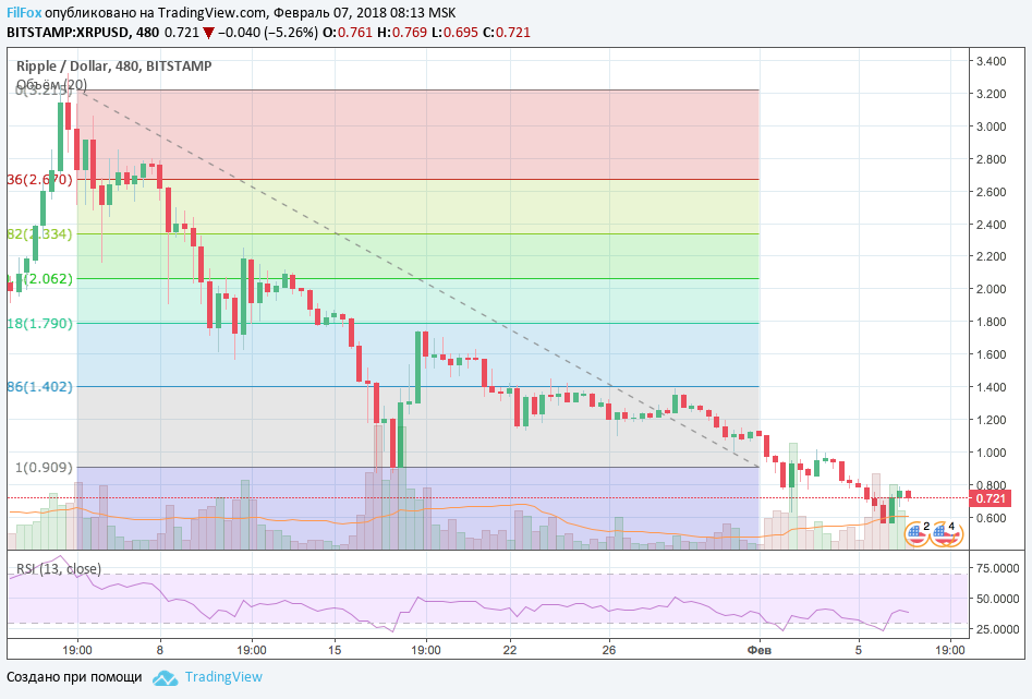 Ripple, вчера установил минимум на отметке 0.563 USD, недобрав до прогнозного значения 0.55 USD всего 0.013 USD. Рипл вчера выкупали, тоже, большими объёмами, в результате цена отскочила в район 0.720 USD. Сегодня следует ожидать небольшой консолидации и снижения к вчерашним минимумам, в область 55 центов за рипл.