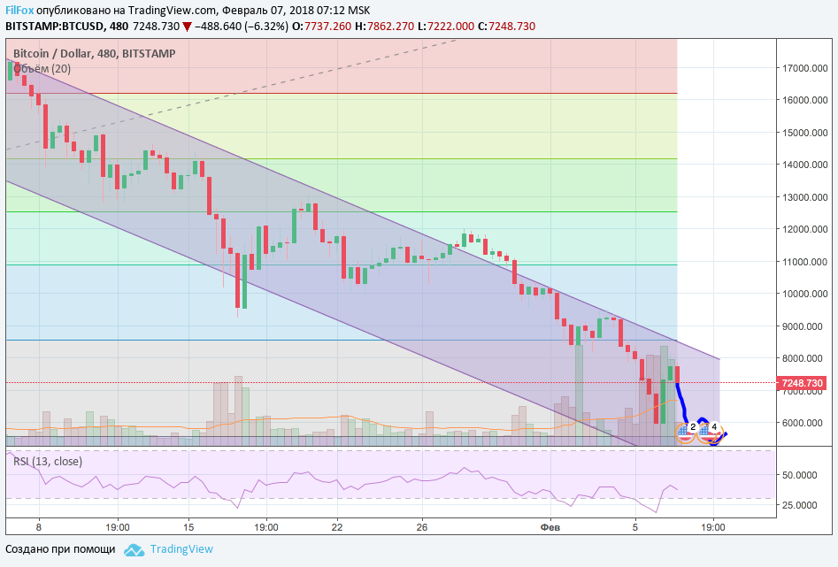 Вчера, после фиксации минимума на отметке 5 920.72 USD последовала волна покупок биткойна, которая вызвала коррекционный рост цены BTC/USD до максимального значения 8150.00 USD. Коррекция немного превысила прогнозный уровень, но проходила в пределах фиолетового нисходящего канала и даже не протестировала его верхнюю границу. В ближайшее время нас ожидает продолжение снижения и тест ключевого уровня поддержки 5 555.55 USD. Не исключается пробой этого уровня и дальнейшее падение к целевым отметкам в области пяти тысяч.