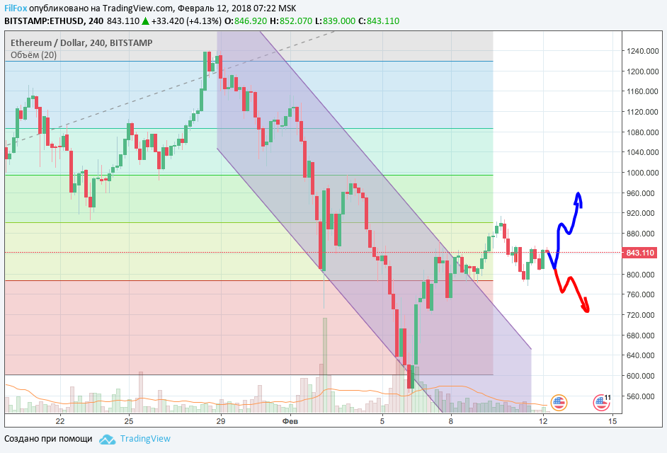 Вчера Ethereum несколько раз пытался преодолеть уровень 850.00 USD, но каждый раз цена отбивалась от этого уровня сопротивления к поддержке на уровне 812.00 USD. Снижение курса Bitcoin потянет цену на эфир в диапазон 750 -720 долларов, а преобладание бычьих настроений поможет пробиться цене в область 950.00 USD.