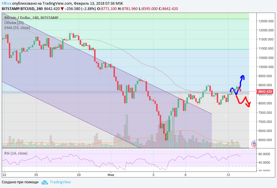 Вчерашние торги по Bitcoin проходили в малых объёмах, на нейтральном новостном фоне, без наличия каких либо существенных позитивных или негативных событий. Цена смогла преодолеть сопротивление на уровне 78.6% фибо (8 574.00 USD), установив дневной максимум на отметке 8 995.00 USD. Однако, сегодня мы наблюдаем постепенное снижение к уровню 8 574.00 USD, который выступает уже в качестве поддержки. Дополнительным уровнем поддержки будет служить и скользящая средняя EMA 55, которая на четырёхчасовом тайм-фрейме, проходит практически параллельно 78,6% фибо. Таким образом закрепление выше этого уровня позволит установить дневной максимум на отметке 9500.00 USD, а продолжающееся снижение в отсутствии импульса ограничится областью «восемь тысяч».