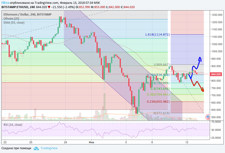 Аналогичная ситуация и по Ethereum. Повторяя рост и снижение Bitcoin как под копирку, цена на эфир отметила максимум на отметке 877.00 USD и пытается консолидироваться на уровне скользящей средней EMA 55 (850.00 USD). Отсутствие больших объёмов и импульса удержит цену в боковике, возле этого уровня цен.