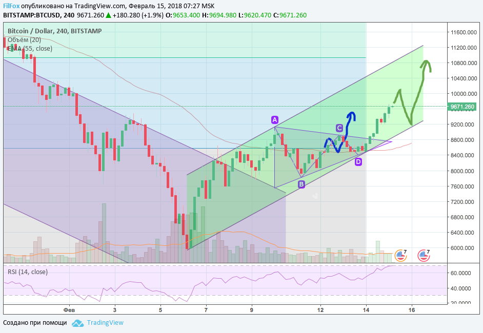 Вчера был получен бычий импульс и цена, пробив верхнюю границу треугольника, установила дневной максимум на отметке 9515.00 USD. Сегодня рост продолжится до психологического уровня 10 000.00 USD. В этой области цена уже неоднократно встречала сильное сопротивление на росте и поддержку при падении. Поэтому, скорее всего, в этом диапазоне цен у нас будет установлен дневной максимум, и коррекция к нижней границе зелёного коридора роста. Вновь замечаем с вами, что торги проходят небольшими объёмами при нейтральном фундаментальном фоне. Сценарий по синей стрелке у нас полностью отработал, и до конца этой недели, наблюдаем за движением по зелёной линии.