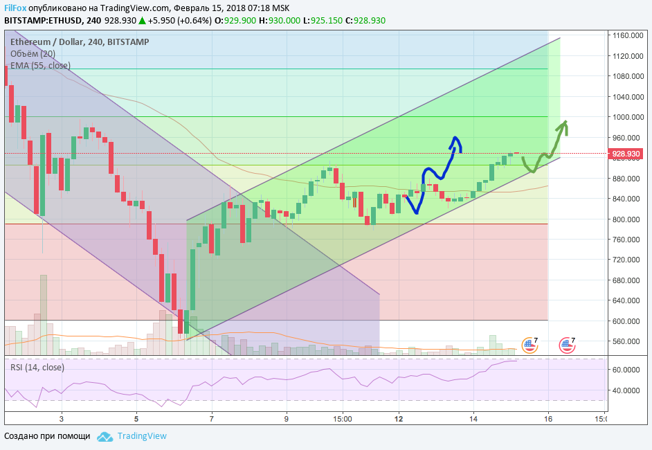 По примеру Bitcoin, эфир 14 февраля продемонстрировал рост, правда немного скромнее, чем предполагалось в прогнозе. Цена на Ethereum установила дневной максимум на отметке 925.00 USD, вместо ожидаемых 950.00 USD. Сегодня рост продолжится к целевому уровню 1000.00 долларов за эфир.