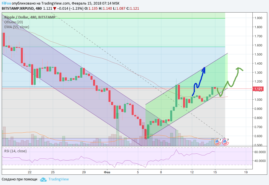 Цена на Ripple вчера уперлась в уровень сопротивления 78.6% фибо (1.138 USD) и так не смогла его преодолеть. Поэтому, отмечаем, что рост к целевому уровню 1.35 USD пока отложен на ближайшее будущее, по предполагаемой зелёной кривой. Пробой уровня сопротивления 1.138 USD и рост к целевому уровню 1.35 USD ожидаем к концу текущей недели, после ре-теста нижней границы восходящего канала.