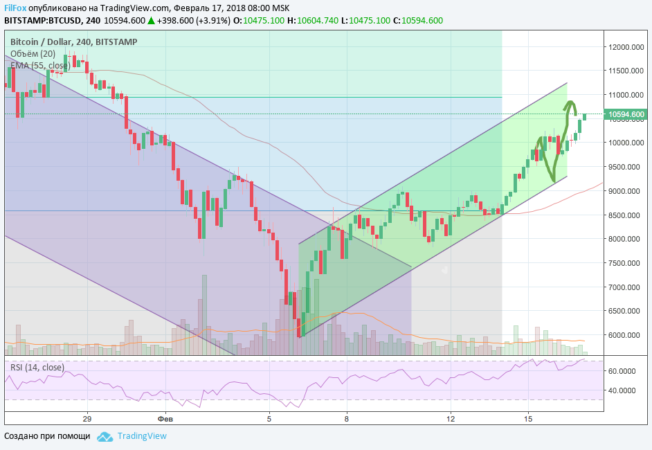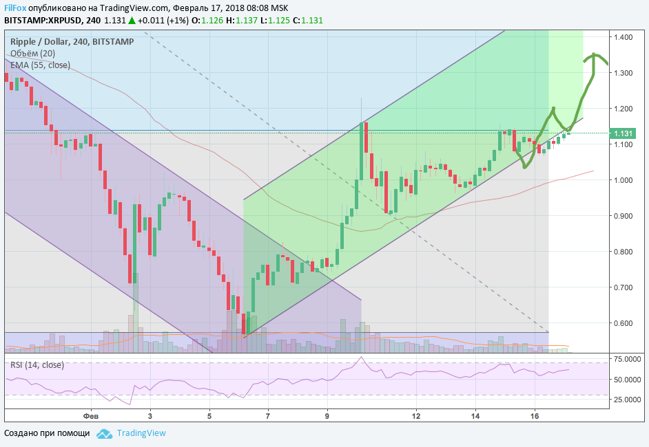 16 февраля, при откате, цена XRP/USD пробила условную нижнюю границу коридора и весь день пыталась вернуться в пределы восходящего канала. Сегодня риплу предстоит ре-тест уровеня сопротивления 78.6% фибо (1.138 USD), но закрепиться выше этого уровня ему не удастся. Вероятнее всего, целевые отметки 1.25 USD - 1.35 USD будут пройдены только в начале следующей недели.