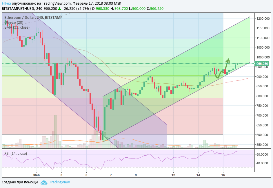 Ethereum вчера тоже снижался к южной границе зелёного коридора, но после небольшой консолидации сегодня продолжил рост. В первой половине дня нас ожидает обновление вчерашнего максимума 951.00 USD, но на подходе к психологическому уровню тысяча долларов за эфир, цена встретит мощный уровень сопротивления, который остановит рост. Полагаю, что сегодня отметка 1000.00 USD не будет преодолена.