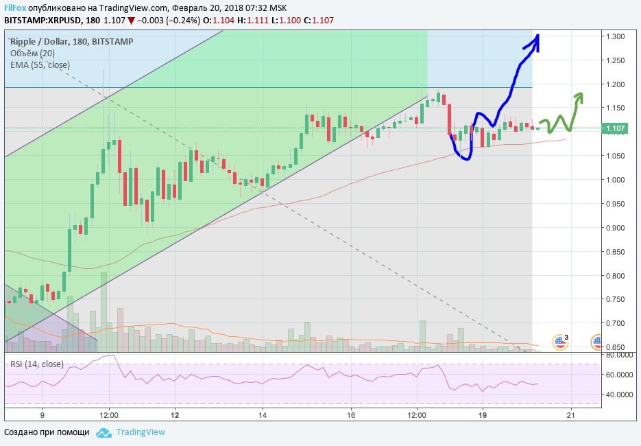 Ripple, вчера, целый день бился в боковике, пытаясь закрепиться выше уровня 1.111 USD. Cудя по объёмам торгов, многие инвесторы решили оставаться вне рынка по паре XRP/USD и понаблюдать за ней со стороны, по крайней мере, пока цена не справится с уровнем сопротивления 78.6% фибо (1.138 USD). Поэтому корректируем прогнозную динамику рипла новой зелёной стрелкой.