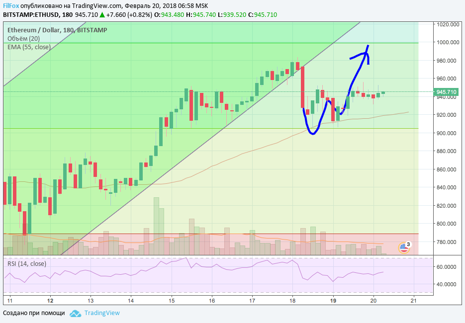 Цена на эфир, вчера, встретила сильное сопротивление на уровне 950.00 USD и рост к психологическому уровню тысяча долларов за эфир пока откладывается. Если перейти на трёхчасовой тайм-фрейм, то можно увидеть, как цена несколько раз пыталась пробить и закрепиться выше этого уровня. Но каждый раз откатывалась ниже отметки 950.00 USD, даже после дневного максимума 955.55 USD. Вероятнее всего, что движение вбок продолжится и сегодня, пока рынок не даст чёткий медвежий импульс.