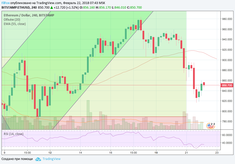 Вчера падение Ethereum продолжилось, и цена, обозначив дневной минимум на отметке 816.00 USD, начала понемногу восстанавливаться. Для того, чтобы продолжить рост, паре ETH/USD нужно восстановиться до уровня 38.2% фибоначи (905.00 USD), а это возможно только при интенсивном росте Bitcoin. Следовательно сегодня наиболее вероятно выглядит движение цены в боковом диапазоне. Ближайшим уровнем поддержки выступает фибоначи 23.6% (788.00 USD)
