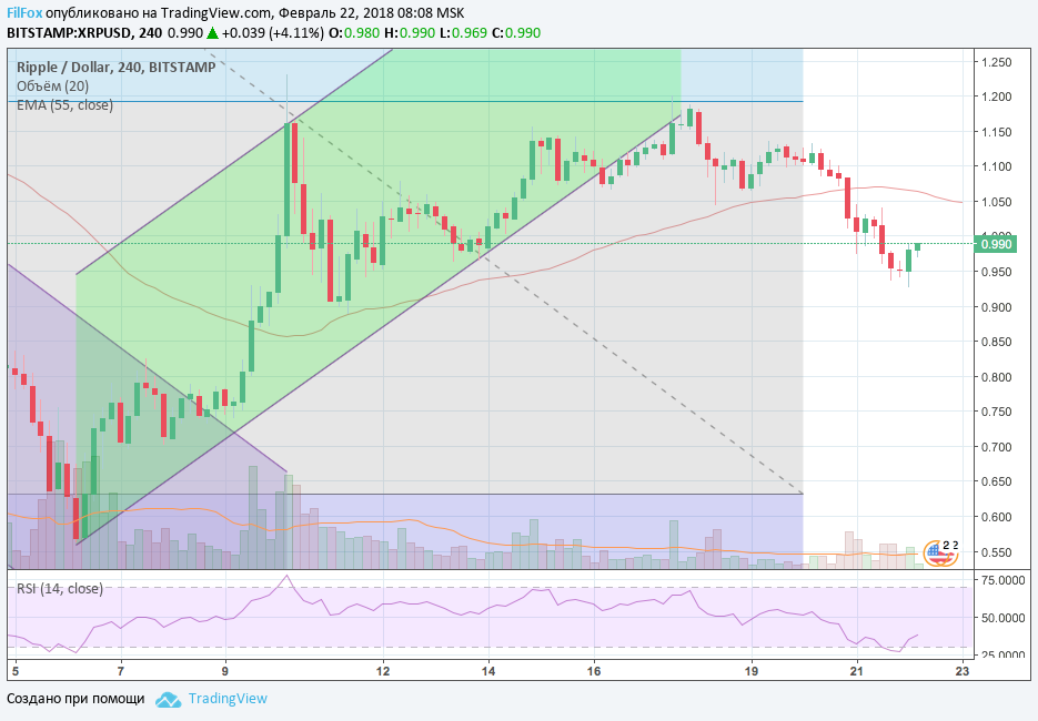 Цена на Ripple вчера продолжила падение, установив минимум на отметке 0.936 USD. Ближайший уровень поддержки 0.900 USD. Сегодня наиболее вероятно движение в боковом диапазоне и постепенный возврат к психологической отметке 1.00 доллар за рипл.