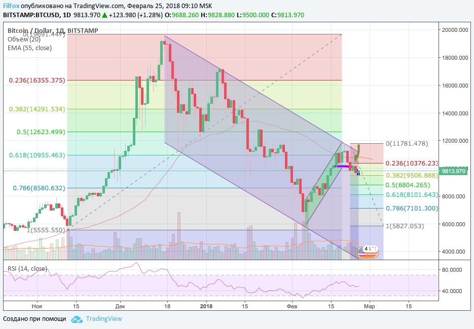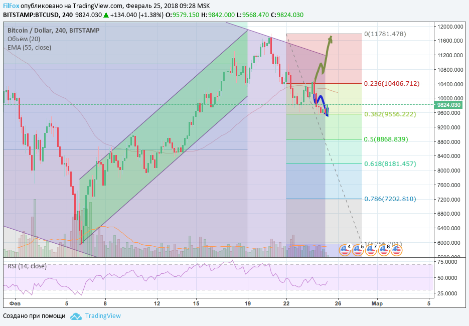 Оно называется «Правило второй волны» и гласит о том, что после первой импульсной волны, вторая, корректирующая волна, не превышает 100% глубины импульсной. Как правило, глубина коррекции ограничивается 61.8% и 78.6% уровнями фибоначи. Если накинуть сетку из уровней Фибоначи на импульсную волну от 6 февраля, то можно, примерно, определиться с возможной глубиной коррекционной волны. Пока цена не упала ниже уровня 7 200.00 USD (78.6% фибо) мы считаем, что рынок находится в коррекции. Если пара BTC/USD опустится ниже, и вплотную подойдёт к минимуму 5 920.00 USD, то только тогда можно говорить о глобальном даун-тренде и искать следующее дно.