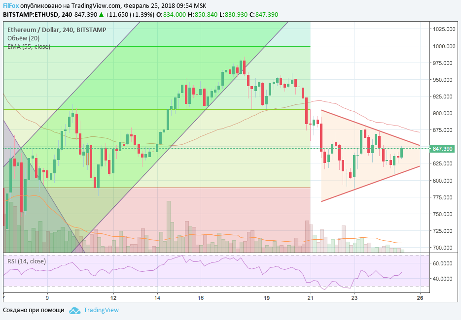 Из-за того, что Bitcoin почти всю неделю находится под медвежьим давлением, остальные альткоины автоматически утратили способность расти. Ethereum всю неделю находился в боковом диапазоне, между двумя ключевыми уровнями поддержки 23.6% фибо (788.00 USD) и сопротивлением 38.2% фибо (905. 00 USD). Пока цена пары BTC/USD будет снижаться, боковик с понижающимися локальными максимумами будет продолжаться, и скользящая средняя EMA55 будет выступать дополнительным уровнем сопротивления.