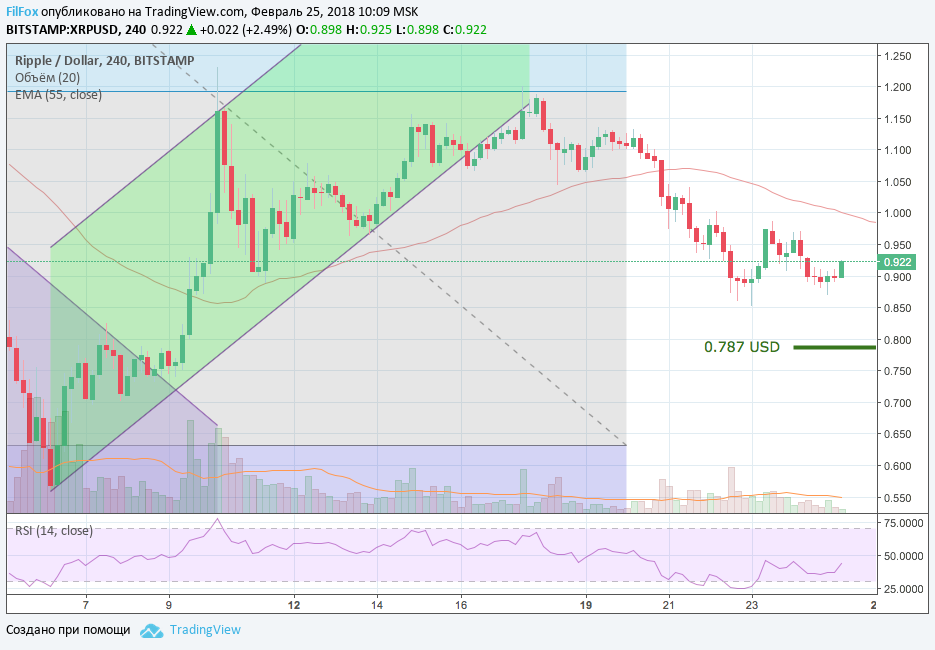 Тоже самое касается и остальных криптовалют, в том числе и Ripple. Цена на пару XRP/USD находится в боковике, постоянно снижаясь. Поддержкой выступает уровень 0.787 USD, а на пути к целевому восстановлению «один доллар за рипл» выступает сопротивление, в виде скользящей средней EMA55. Всё изменится, как только прояснится ситуация с Bitcoin.