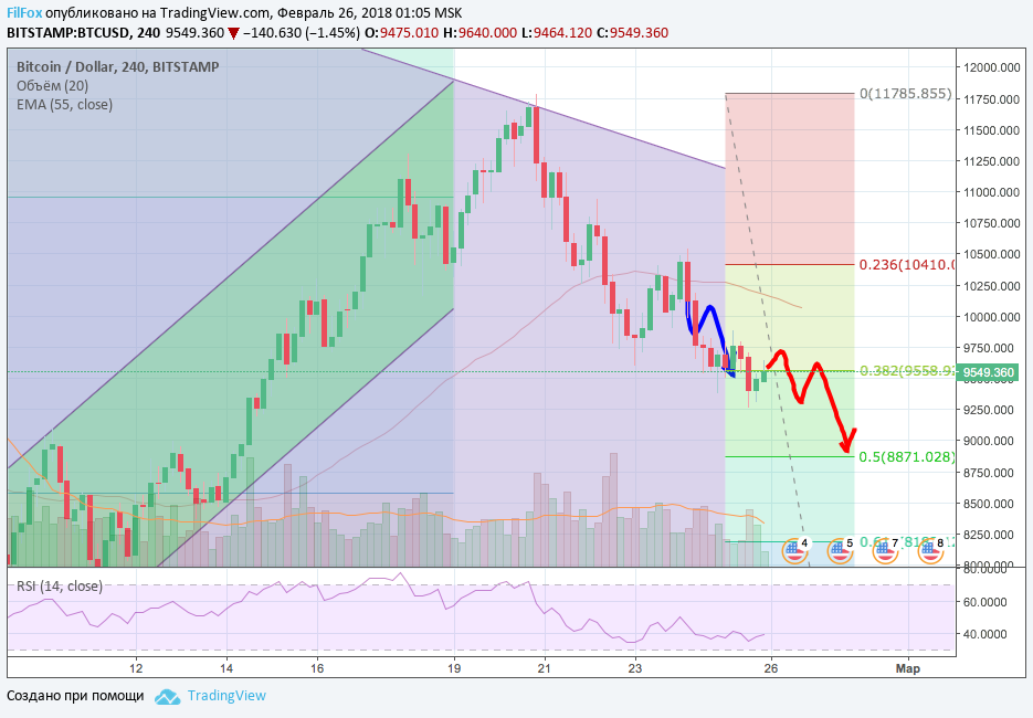 В начале этой недели ожидаем дальнейшее снижение курса Bitcoin к уровню поддержки 50% фибоначи (8 871.00 USD). Прежде чем цена протестирует этот уровень поддержки, возможна некоторая консолидация в районе 38.2% фибо (9 558.00 USD), но, полагаем, что отскок от этого уровне менее вероятен, чем от 50% фибо.