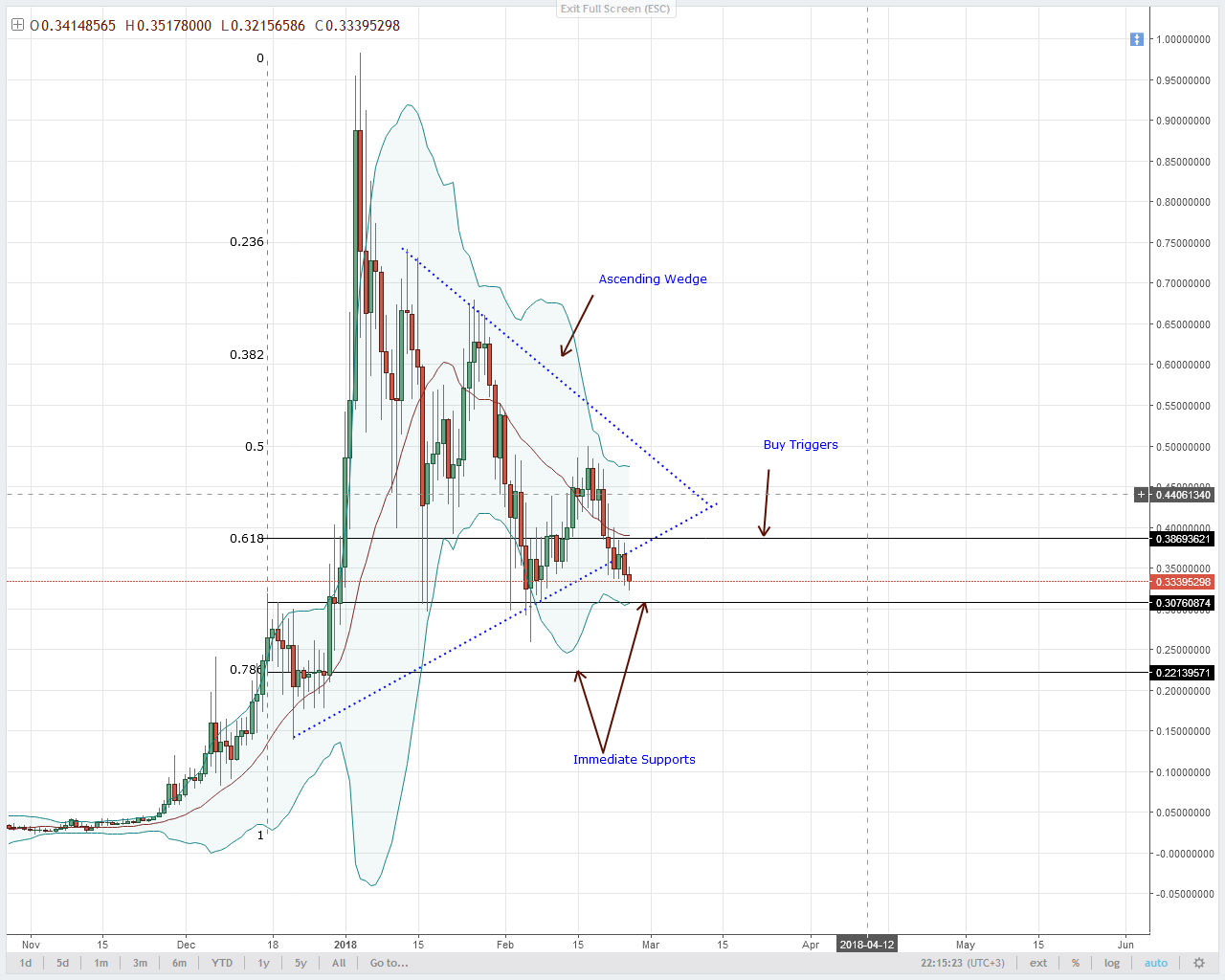 Сейчас возможна консолидация в диапазоне между $0.40 и $0.22 со среднем уровнем поддержки в $0.30.