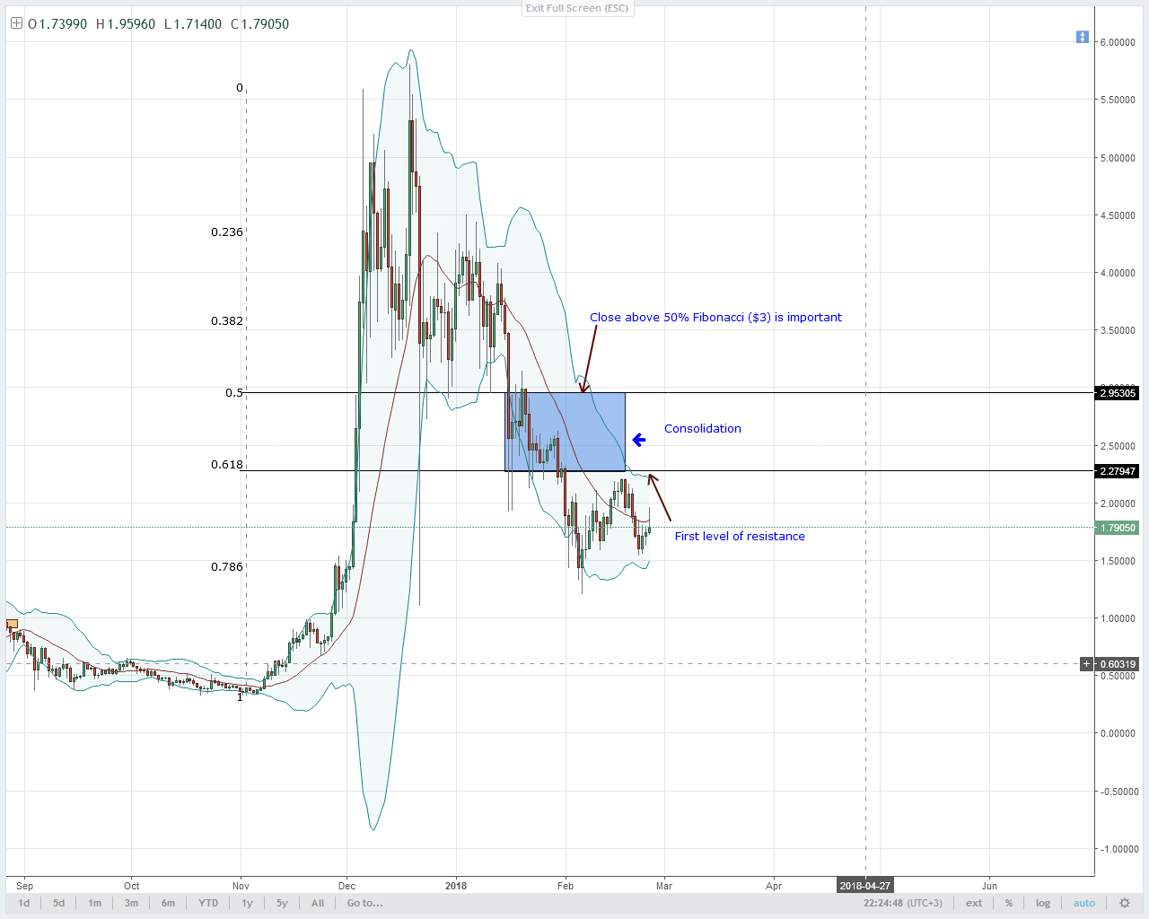 Конечно, как и в моем предыдущем анализе, я остаюсь нейтральным по этой паре, потому что цены до сих пор не достигли отметки в $3, что является, по моему мнению, главной линией сопротивления и индикатором покупки. Даже сейчас, после вчерашнего утреннего пампа и неудачи закрытия выше уровня средней BB, я все еще думаю, что покупатели доминируют. Поэтому, если будет восстановление цены и рост выше $1.95 или выше вчерашнего максимума, быки могут покупать и рассчитывать на уровень $2.2, который является нашим ближайшим сопротивлением.