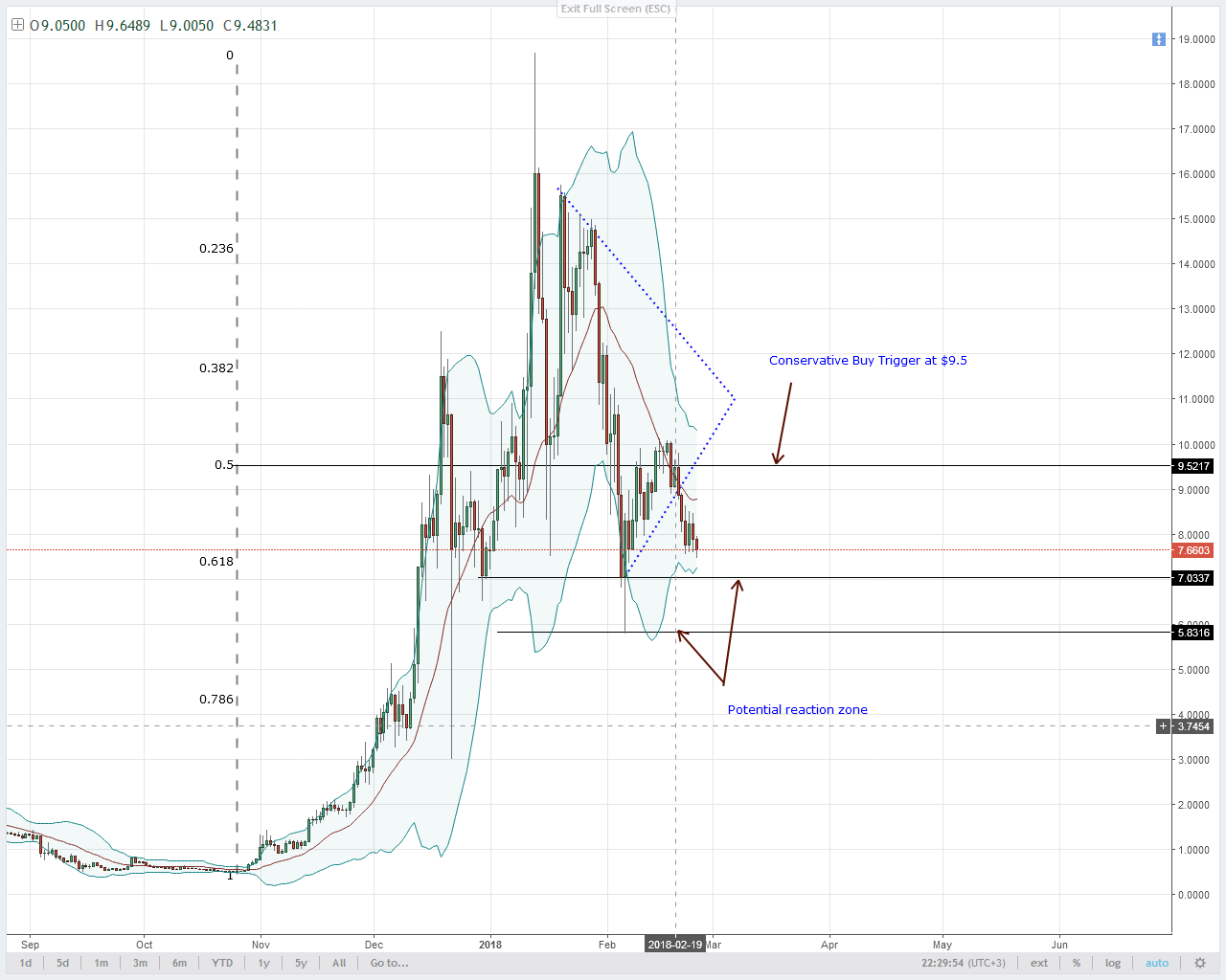 Похоже на то, что продажа EOS преобладает на данный момент, и, вероятнее всего, цена достигнет $7, которая стала ключевой зоной сопротивления 5 и 6 февраля, когда двойная свеча не смогла ее пробить. Кроме этого мы должны внимательно следить за боковой консолидацией периода 22-25 февраля, поскольку они - наши временные минимумы и максимумы. Оптимисты могут начинать искать возможности купить на промежутке $5.8 и $7, но если сегодня цена на графике поднимется выше $8.5 или средней BB, то $9.5 станет нашим сигналом для покупки.
